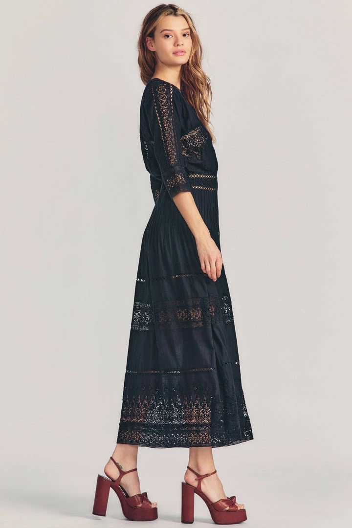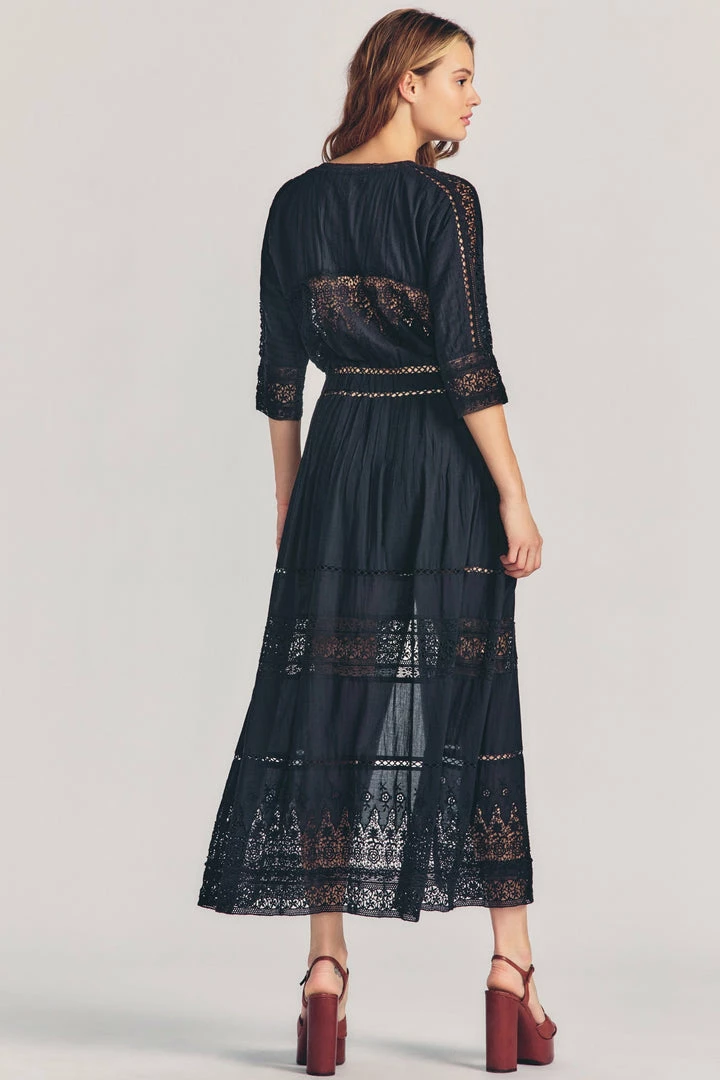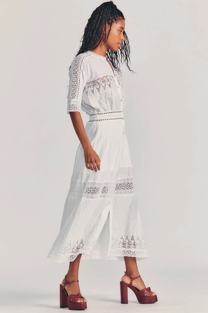 Our forever favorite Edie Dress is reimagined in airy hand-dyed cotton with elaborate panels of inset crocheted lace. This relaxed dress is perfect as a beach coverup or party dress. This dress features a crewneck, mother-of-pearl buttons descending at center front, cuffed elbow sleeves, and an easy flowing maxi-skirt. Comes with a half-slip. Accessorize your Beth Dress with our LoveShackFancy x Lova The Flower Gold Earrings.