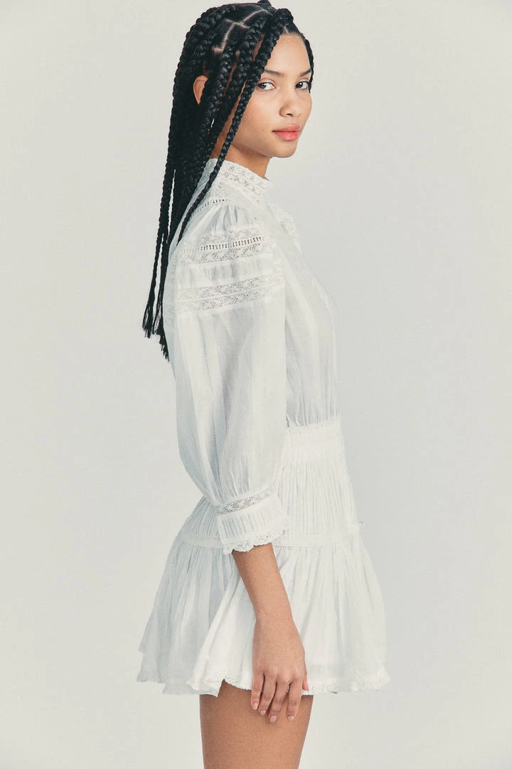 Our Victorian-inspired Viola Dress arrives in custom dobby cotton with inset floral lace and lofty wildflower embroidery. This relaxed frock has a high collar and an inset triangular lace yoke above an elastic waist. A hidden placket with center buttons lines the back. Shirred elbow-length puffed sleeves are finished with a pintucked cuff, mirrored by pintucking at the top panel of the miniskirt. Shown here in Antique White. Accessorize your mini with our LoveShackFancy x Lova Dolce Vita Heart Flower Earrings.