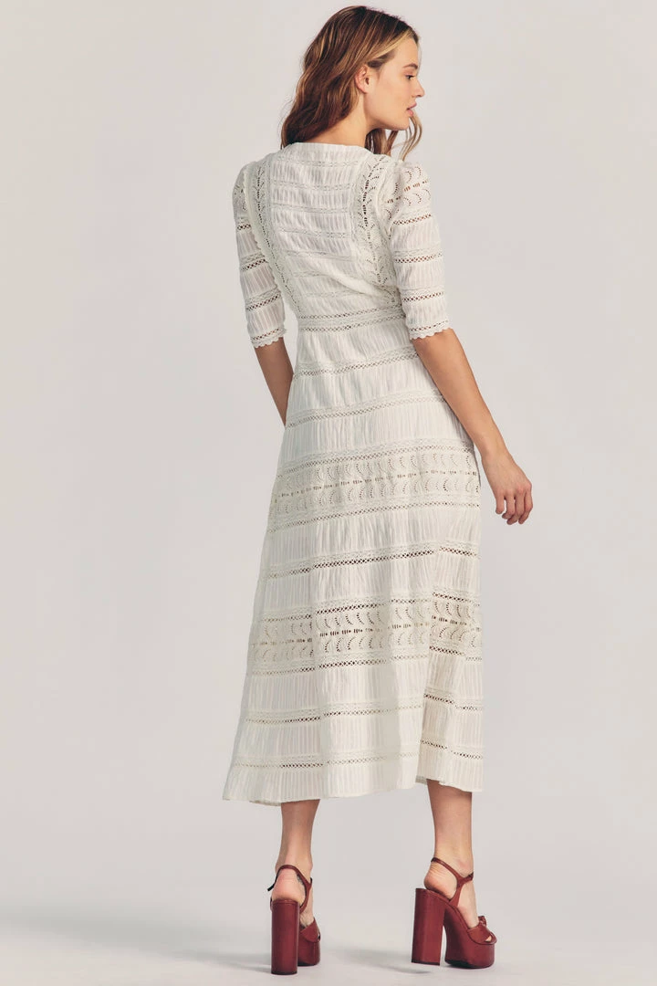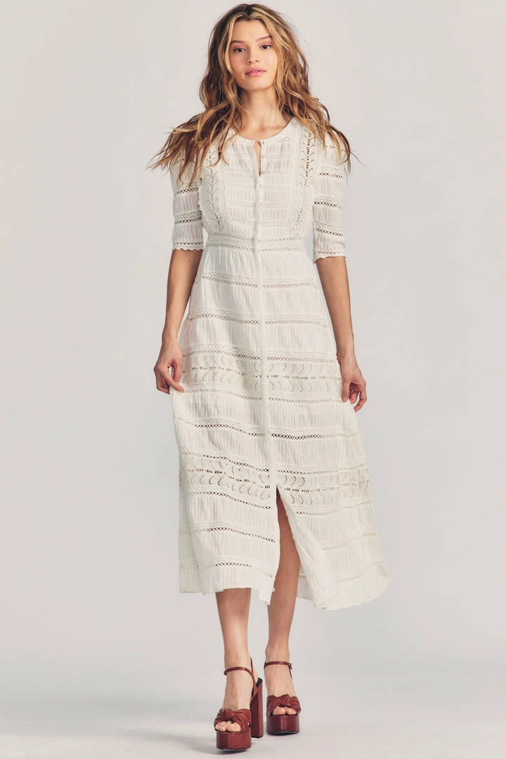 Our Flora dress is a forever favorite in Balearic lace. This dress is intricate and elegant with mother of pearl buttons down the length of the body. The sleeve is slightly shirred at the shoulder and finished with a darling ruffle at the elbow-length hem. The maxi length skirt features alternating strips of pin-tucked cotton, schiffli embroidered eyelet, and custom inset lace trims. The inset lace waistband is flat at the front with elastic at the back for ease of wear. Accessorize your Flora Dress with our LoveShackFancy x Lova Gold Heart Beige Lace Fringe Earrings.