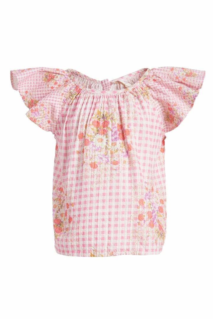 If you like the Lou Dress, you’ll love our Kari Top, a foreshortened version of that signature. This sweet blouse, in cotton with a picnic print, has a shirred circle neck, flutter sleeves and buttons down center back. Wear it as a set with our Girls Billie Skirt. Shown here in Berry Picnic.