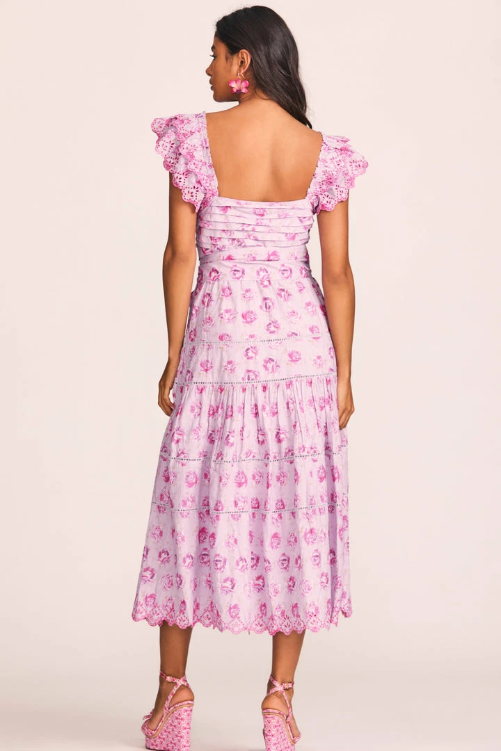 Our Harlyn Dress is timeless in 100% cotton with our hero hand-painted rose print of the season, eyelet embroidery and inset embroidered panels. This sweet empire frock has a square neckline with raw ruffle trim, a pleated bodice and double flutter sleeves with scalloped edges. The shirred skirt falls to midi-length with a scalloped hem. Pair your midi dress with our matching Lorna Barrette.