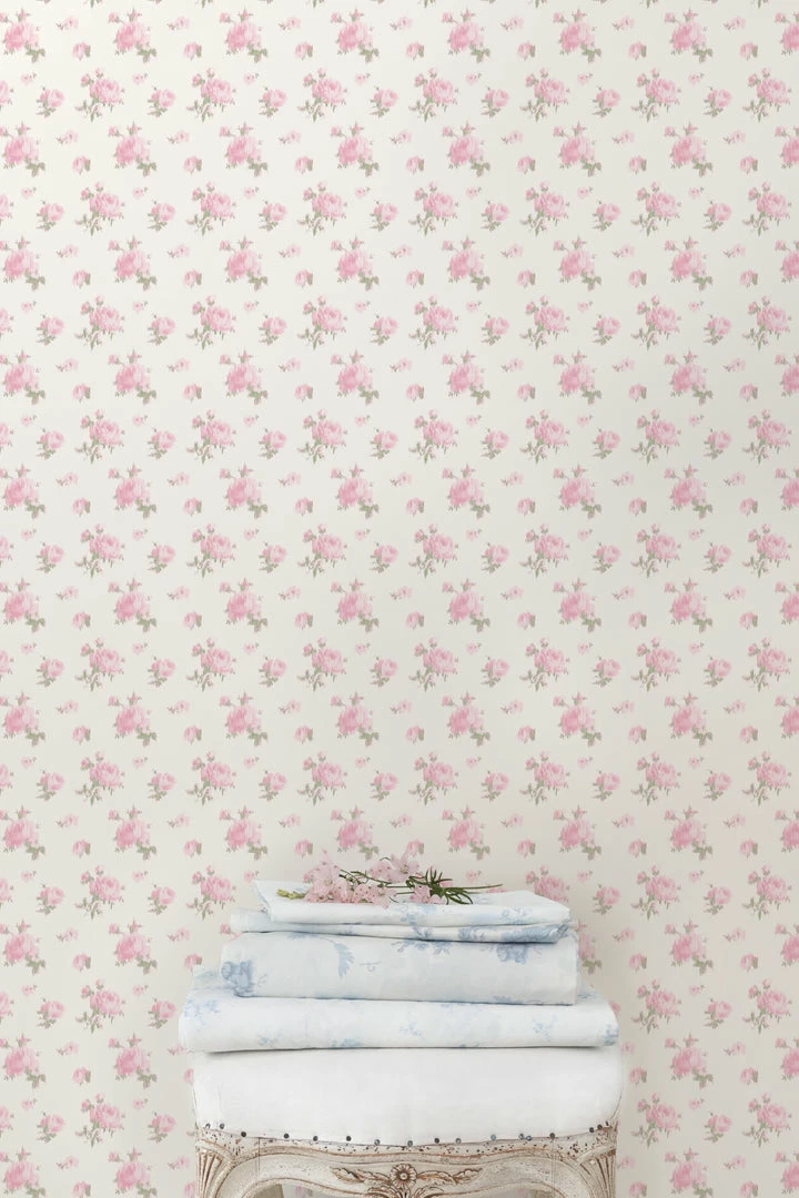 Inspired by ikat fabric, this floral wallpaper brings romantic elegance to your interiors. The pink roses and green leaves are seemingly stitched into the creamy white backdrop. Each roll measures 20.5” x 33′. Mix and match with our Pastiche De Bouquet Sheet Set and our La Vie En Rose Quilted Duvet Cover & Sham Set. Shown here in Tinted Petals.