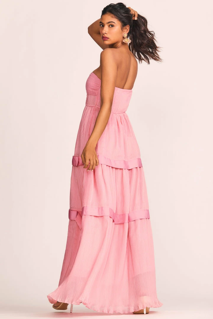 Our Teresa Gown is a vision in pleated organza with grosgrain ribbon details. This flowing dress is strapless with a prominent rosette at center bust. The fitted bodice features flattering princess seams to the waist, where it lets out into a dramatic full sweep skirt to the floor. Separate belt. Shown here in Candy Pink. Pair your gown with our LoveShackFancy x Sophia Webster Lilico Sandal.