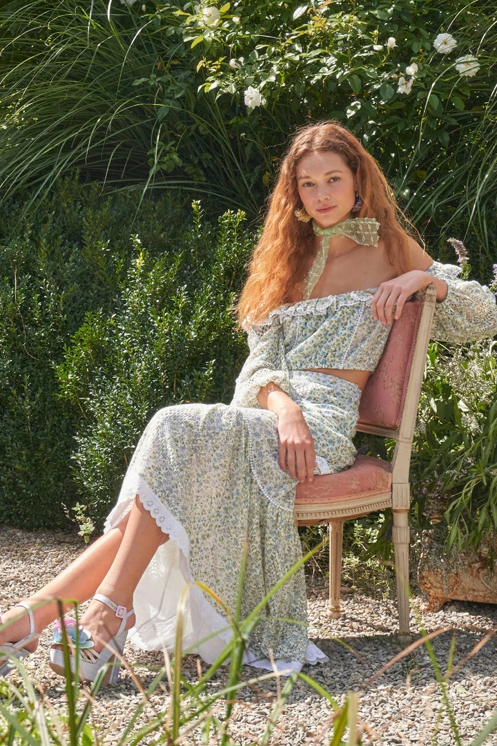 Our new Dorabella Crop Top stuns in a combo of lace and custom eyelet fabric with a ditsy rosebud print and bobble trimming. This ultra romantic top has an elastic-encased square neckline, worn on or off the shoulder. The sheer bracelet sleeves finish with elastic at the wrist, mirrored at the cropped bottom hem. Wear it as a set with our Diamond Mini Skirt.