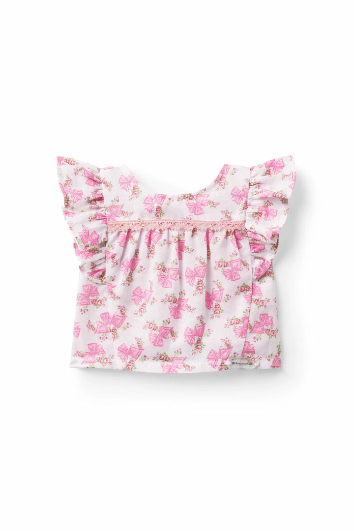 Our Fancy Flutter Top for your American Girl Doll makes a sweet statement with a pink bow and rosebud print. This short relaxed fit top has a victorian-inspired high neck with lace adorned chiffon. Ruffles at the princess seams form flutter sleeves. Pair it with our Doll Rosy Ruffles Mini Skirt. Show here in Pink Mint.