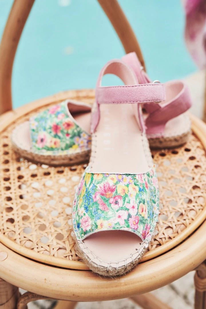 Introducing the LoveShackFancy x Manebi Girls Sandal. The velcro strap ensures extra comfort to get a free adventure and easy wearable experience. These espadrilles will come withåÊan exclusive cotton bag. Pair it with our girls Lou Dress. Shown here in Wildflower Multi.
