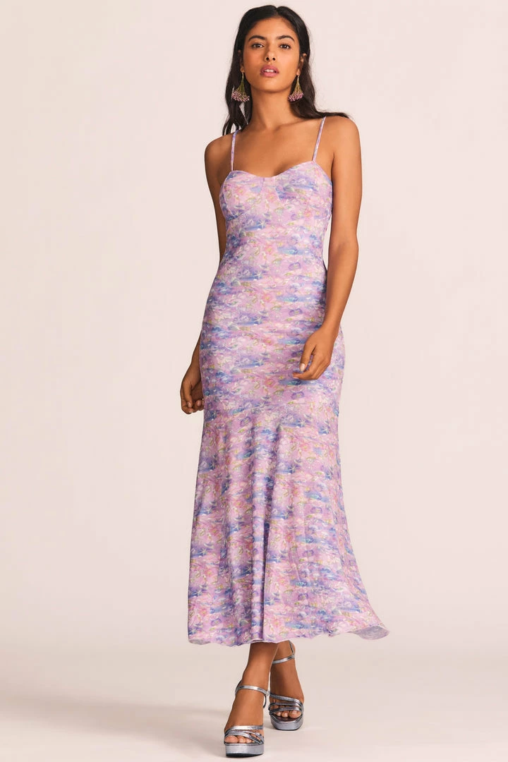 Our Zaya Dress is a showstopper in a new 100% cotton stretch with a hand-painted twilight floral print. This extra special piece has adjustable spaghetti straps, seamed cups at the bust and a fitted silhouette to the hip, where, below a seam, the skirt fans out into a full dramatic sweep to the floor. Pair your maxi with our LoveShackFancy x Sophia Webster Celia Platform Sandal. Shown here in Plum Jelly.