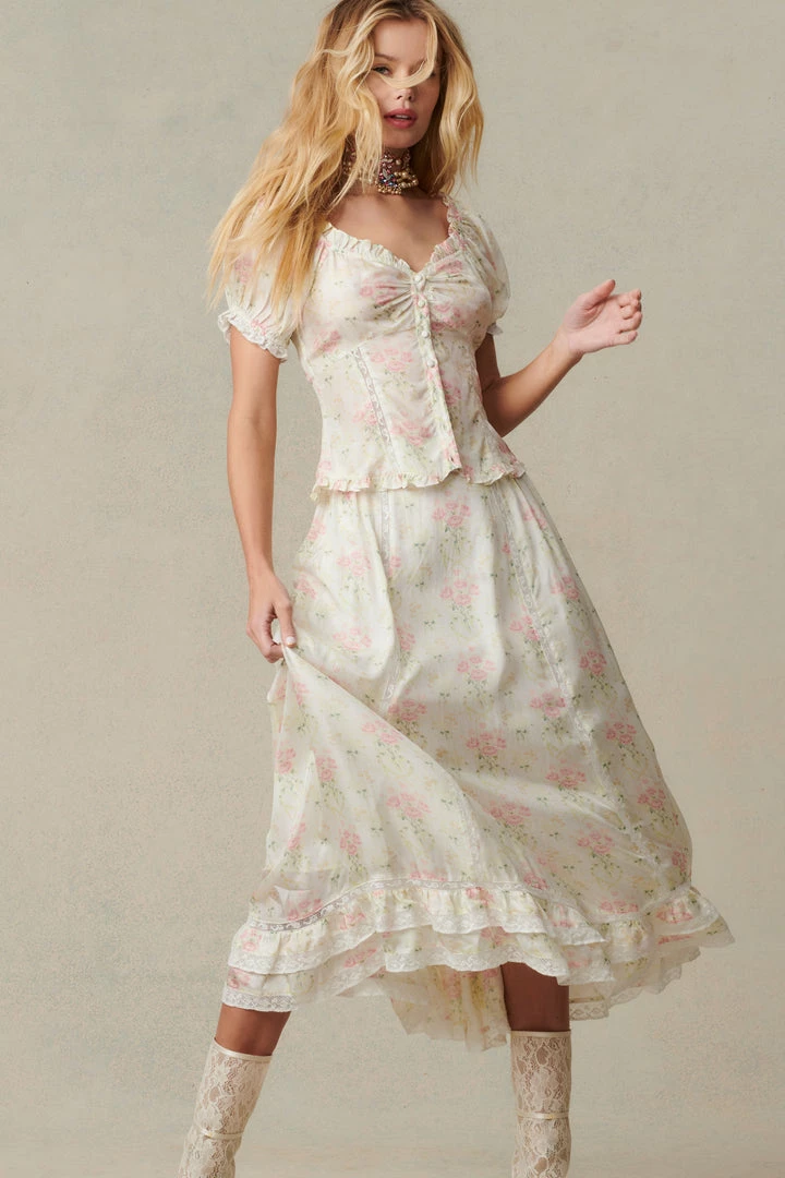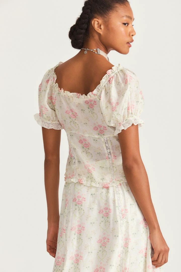 Our Creative Director, Rebecca Hessel Cohen’s favorite Bryant Top makes its return in an airy, silk fabric for the first time, with our hero print of the season, Belfast Habotai. The elevated, lightweight top channels all the Bridgerton vibes with sophisticated design details; a peplum cut with slight shirring, and intricate custom laces. Wear it as a set with our Navya Skirt. Shown here in Baby Pink Dreams.