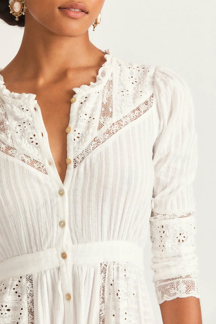 Our newest Darlene Victorian Maxi is an everlasting essential. A signature LoveShackFancy style with a new Victorian silhouette featuring a shaped yoke neckline, elbow length sleeves, and classic center front placket. With inset lace, custom embroidery, and unique detailing, this is the dress of the season. Accessorize it with our LSF x Lova Flower Earrings. Shown here in True White.