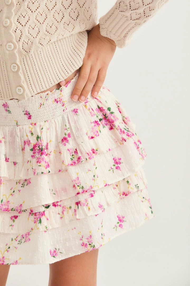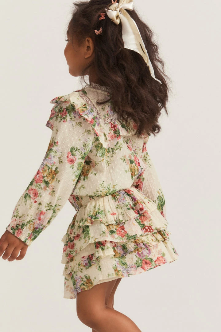 Our Billie Skirt is reimagined in 100% cotton in our hero print of the season ; a French textile-inspired floral Victorian, a favorite of our Creative Director’s Rebecca Hessel Cohen. Below a wide smocked waistband, the skirt falls to two shirred tiers with ruffle details. Pair this with our Mini Janie Cardigan.