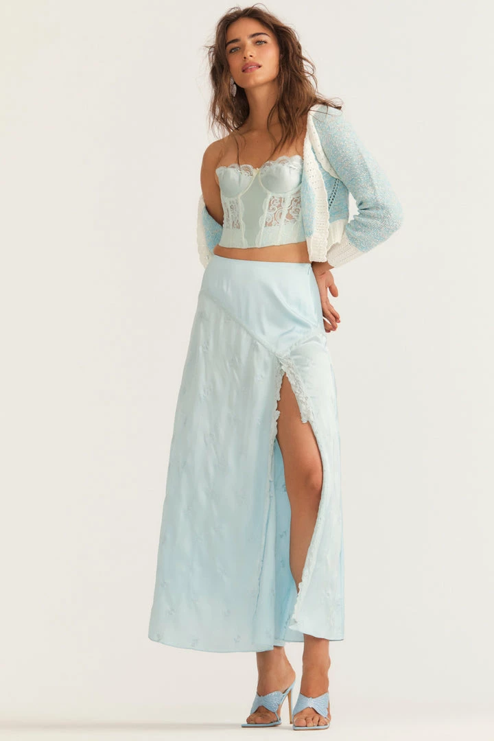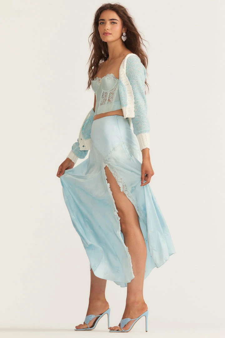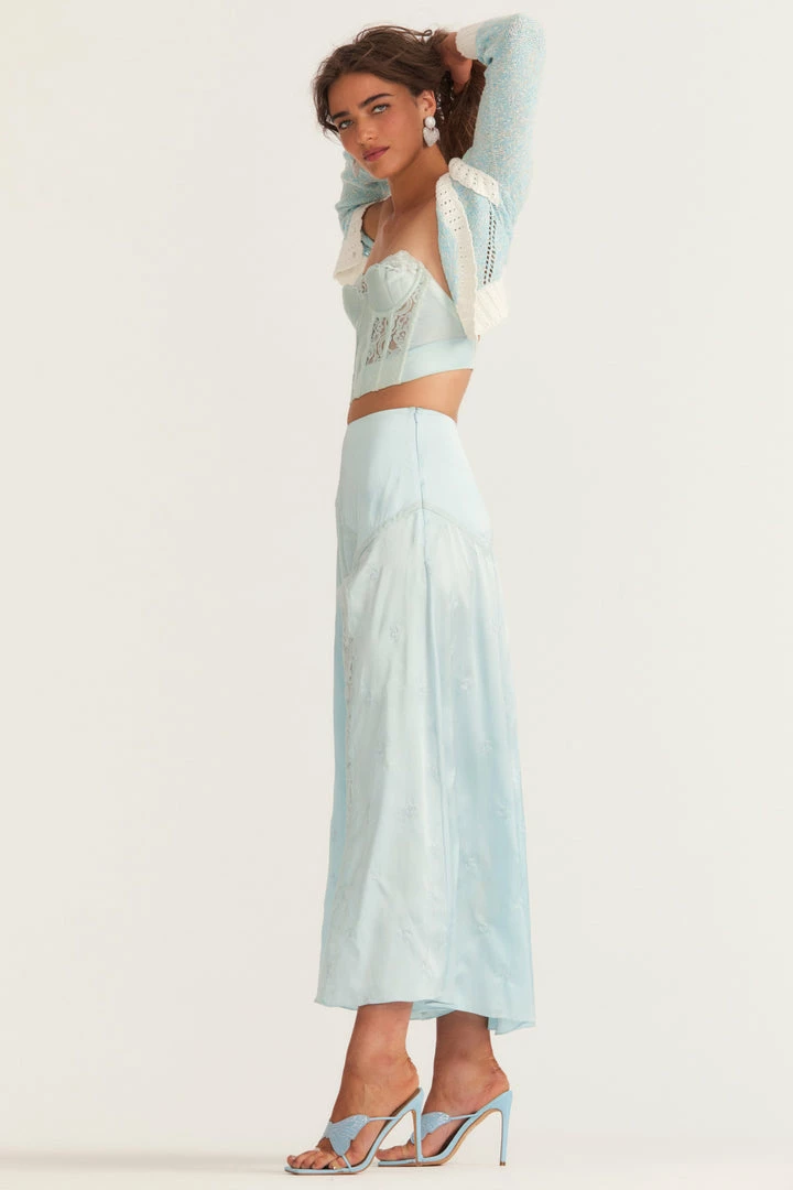 Introducing our Gracia Skirt, an irresistible silk maxi skirt inspired by sourced vintage slips. Our beloved Ziggy Skirt gets a seasonal update featuring a high slit, princess seams and custom lace embroidery detail throughout. Wear it with our Geneve Crop Cardigan. Shown here in Angel Blue.