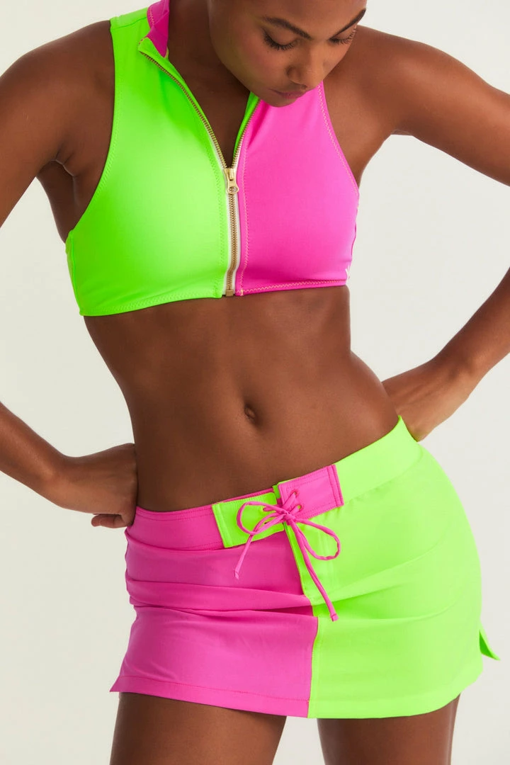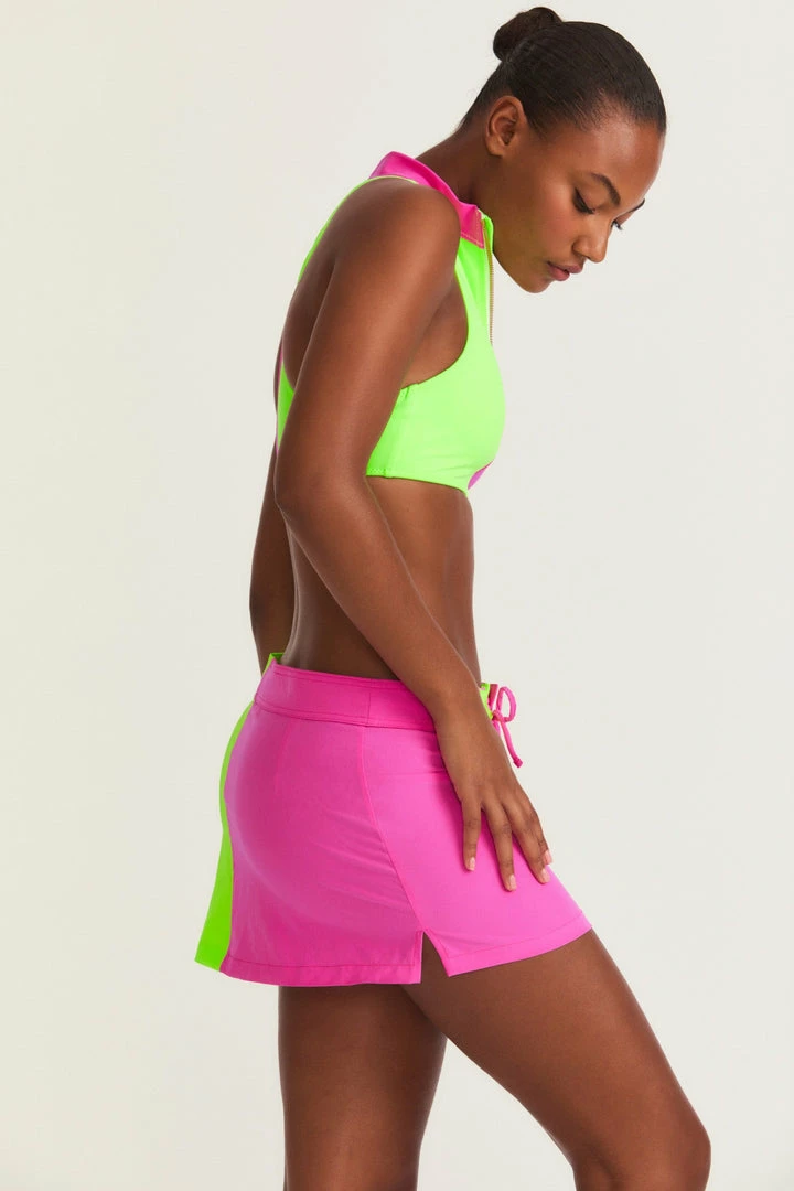 Summer day dreams come true with our new LoveShackFancy x Hurley Boardie Skirt. This breezy, two-tiered mini is as fun as can be with neon color blocking. Pair it with our LoveShackFancy x Hurley Bow Back Top for the ultimate beach look. Shown here in Magenta Neon Lime.
