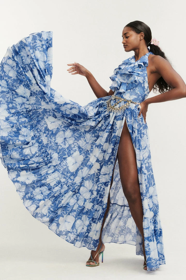 A seaside vision in our new Marinette Dress with a cotton silk fabric and mermaid, hibiscus print. This low cut halter top features an exaggerated ruffle. This maxi dress features a mermaid, hibiscus print with a fitted bodice above a pleated skirt with a high, flirty slit. This dress features functional pockets. Accessorize it with our LSF x Lova Flower Gold Earrings. Shown here in Salty Sea.