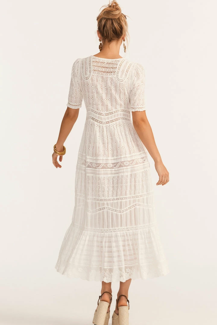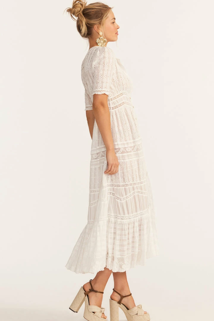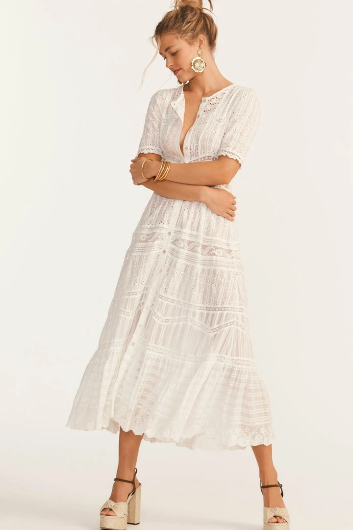 Introducing our Medina Victorian Maxi Dress. Find us dreaming in this hero, Victorian dress of the summer. This special piece features intricate layers, detailed laces and custom embroidery designed throughout. This frock comes with a separate slip to be worn beneath. Wear it as a coverup over our Harbor Bikini Set. Shown here in True White.