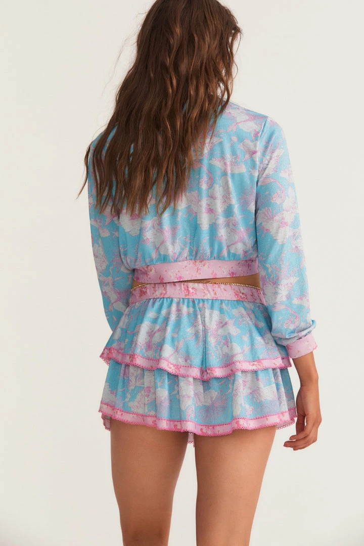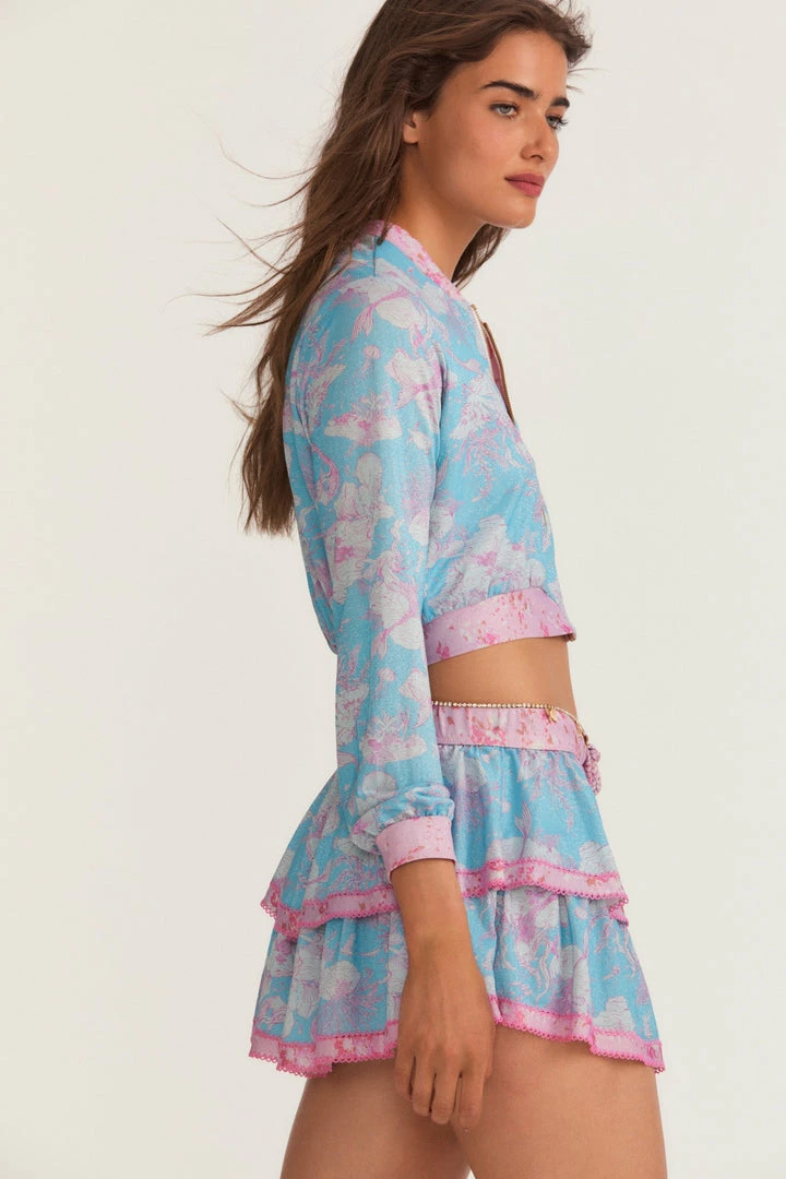 So in love with our LoveShackFancy x Hurley Under The Sea mini skirt. This dreamy two-tiered mini is the perfect summertime staple with a playful mermaid print and floral print detailing. This piece features a drawstring tie for functional fit. Pair it with our LoveShackFancy x Hurley Under The Sea Bomber to complete the look. Shown here in Under The Sea.
