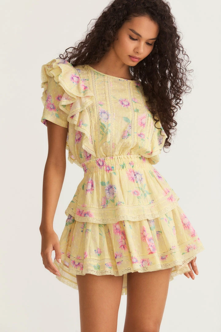 Our signature Natasha Dress is back for the summer in a dreamy, new floral print. This easy frock features double ruffled flutter sleeves, which cascade down the front and back of the body to highlight the elasticated waist. Intricate custom lace panels are inset and trim the skirt’s flounces.