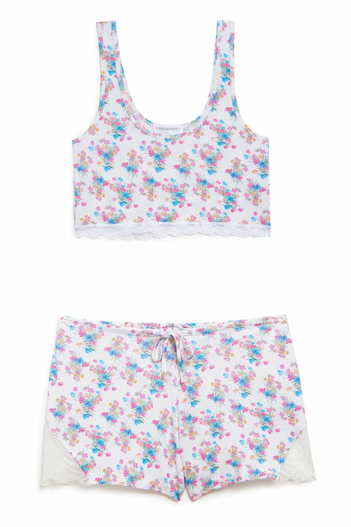 The Cabbage Rose Bow Lace Crop Top and Short Set made from ultra-soft and sustainable, TENCEL™ fabric is heaven sent. A super comfy scoop neck tank with a playful rosey print paired with matching, breathable shorts. Both pieces are embellished with intricate lace detail for a romantic touch. Shown here in Cabbage Rose Bow.