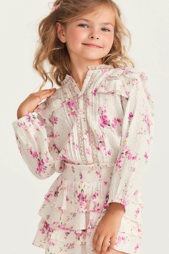 Our sweet Oda Top makes its entrance in 100% cotton in our hero print of the season ; a French textile-inspired floral Victorian, a favorite of our Creative Director’s Rebecca Hessel Cohen. This easy, transitional summer-to-fall blouse features intricate custom lace detail at the round neckline and throughout the ruffle-adorned bib, airy long sleeves and small embroidery detail all over. Complete the set with our Girls Billie Skirt.