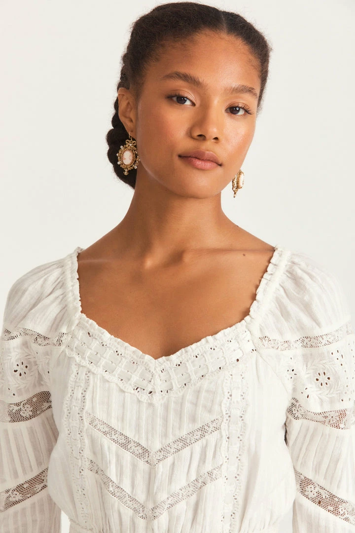 Our Sanaya Dress debuts as our new hero Victorian frock of the season. This updated, forever silhouette makes its entrance in 100% cotton with the dreamiest details; intricate custom lace details among alternate tucking throughout the body and custom eyelet embroidery. This long-sleeved mini features encased elastic at the waist and at the shoulder, and pretty scalloping at the multi-tiered skirt. Accessorize it with our LSF x Lova Heart Flower Earrings. Shown here in True White.