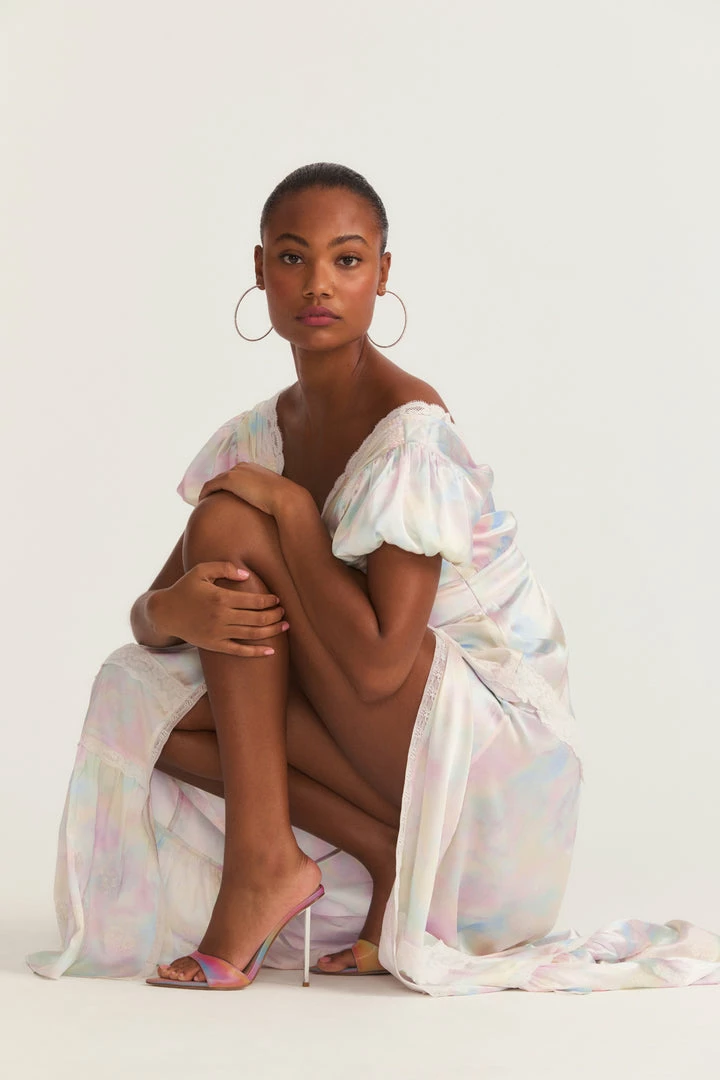 Having a moment in our Quintessa Dress. This maxi dress is fit for a princess in our fairytale, tie-dyed print with top-applied custom laces with floral embroidery, a deep v-neckline, lace insets and a slit on the wearer’s left side. Accessorize it with our LSF x Lova Gold Flower Earrings. Shown here in Fairytale Tie Dye.