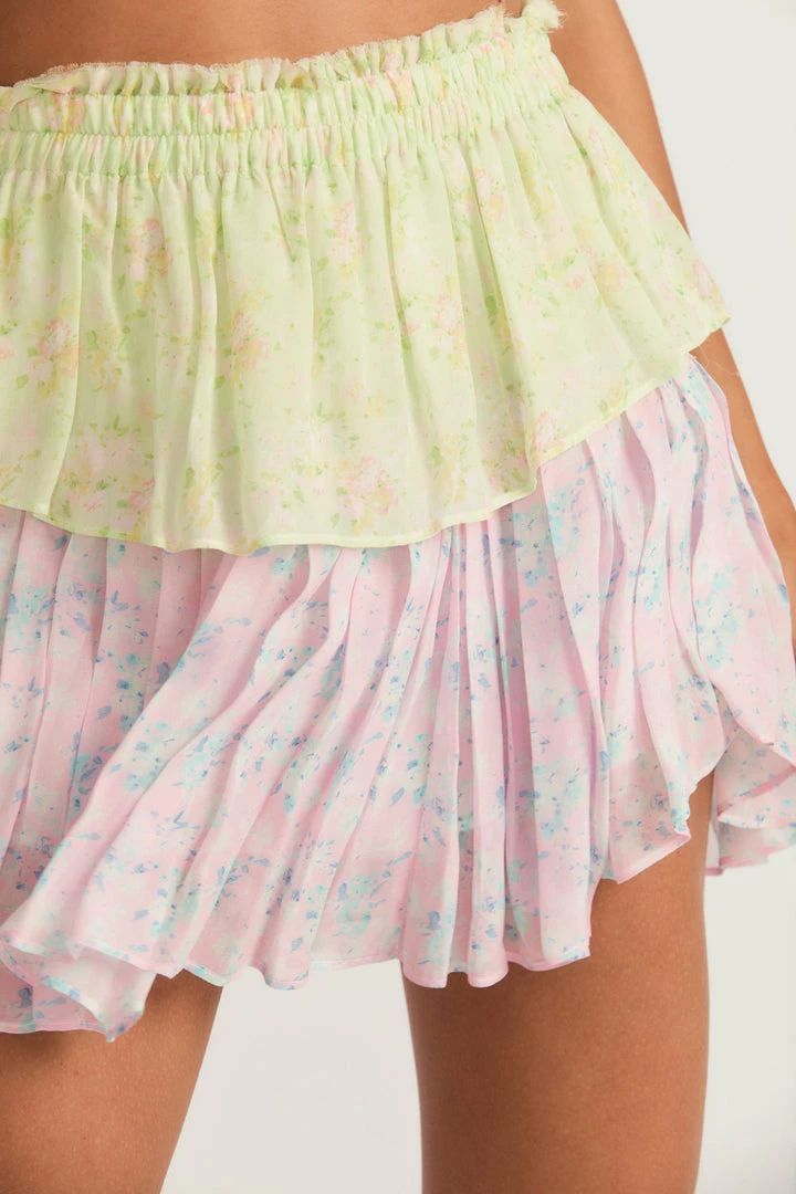 Our signature Ruffle Mini Skirt is back and ready to party. This mini is reimagined in a technicolor neon, colorblock, daisy print. The two-tiered short skirt, with an elasticated waistband and shirred flounces, dances along with you as you move throughout the world. Pair it with our Calix Tee. Shown here in Fuji Sunrise Print Mix.