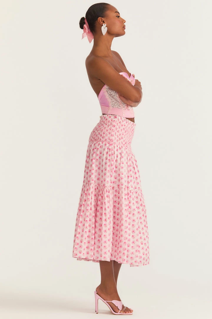 Our Swift Skirt serves from top to bottom. This three-tiered midi skirt features an elasticated waist over a fitted top that falls to slightly pleated flounce. Wear it as a with our Geneve Crop Cardigan. Shown here in Pink Divine.