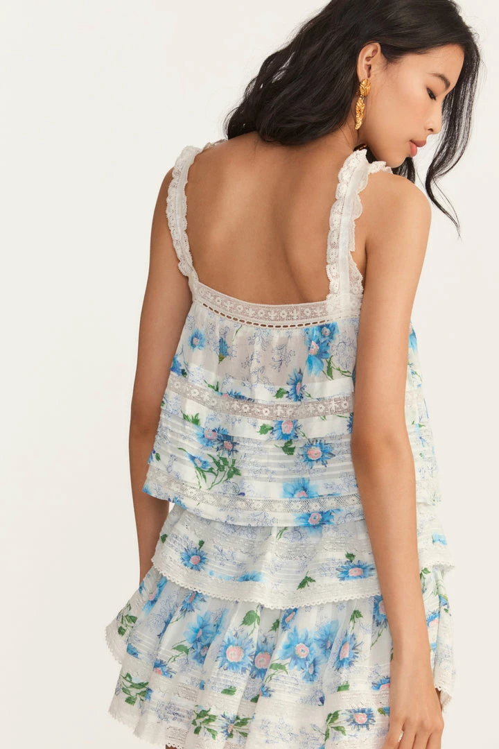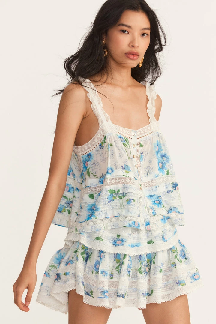 Our Sully Top is back with lofty embroidery, sheer inset floral lace panels and pintucking. The straps of this hand-dyed cotton tank blouse are constructed with satin ribbons, bordered by scalloped lace. Functional pearlescent buttons line the center front of the roomy bodice. The bottom features a scalloped trim, finished with broderie anglaise embroidery. Wear it as a pair with our Ruffle Mini Skirt. Shown here in Blueberry Cloud.
