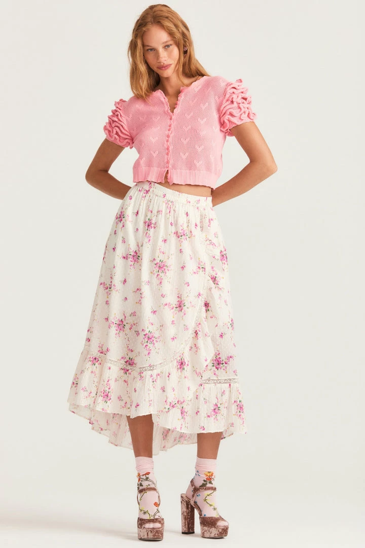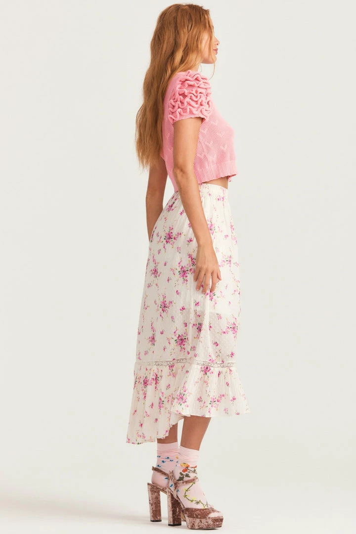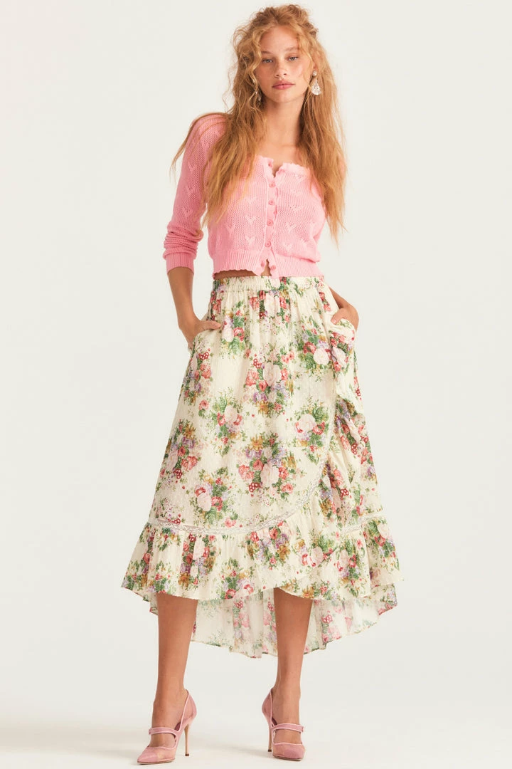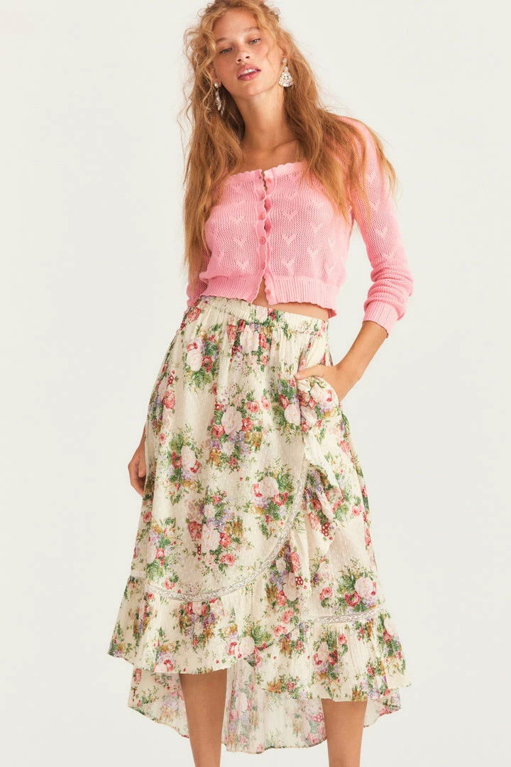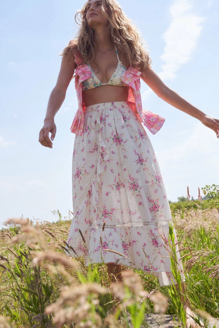 Debuting as the must-have summer-to-fall transitional skirt, the Viva Skirt is lovely as can be in our hero print of the season; a French-textile inspired floral Victorian, a favorite of our Creative Director’s Rebecca Hessel Cohen. This faux wrap midi steps on the scene in 100% cotton featuring intricate custom lace inset detailing, a full shirred flounce, encased elastic at the waist, and a slight high to low finish. Pair it with our Drea Crop Top or Preilla Crop Cardigan.