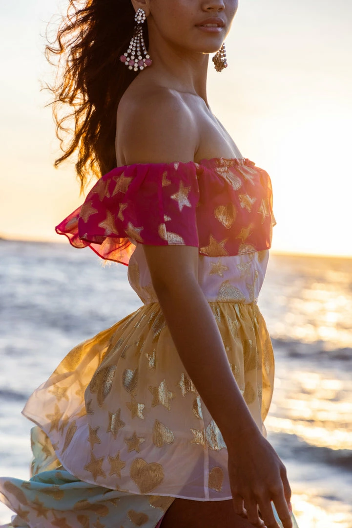 Our Vynne Maxi Dress is a moment with a multi-tier custom star and heart ombré color block print with ruffles to the floor. This off-the-shoulder dress features a flirty slit at the wearer’s right. Accessorize this with our LSF x Love Gold Flower Earrings. Shown here in Surfer Fuschia Light.