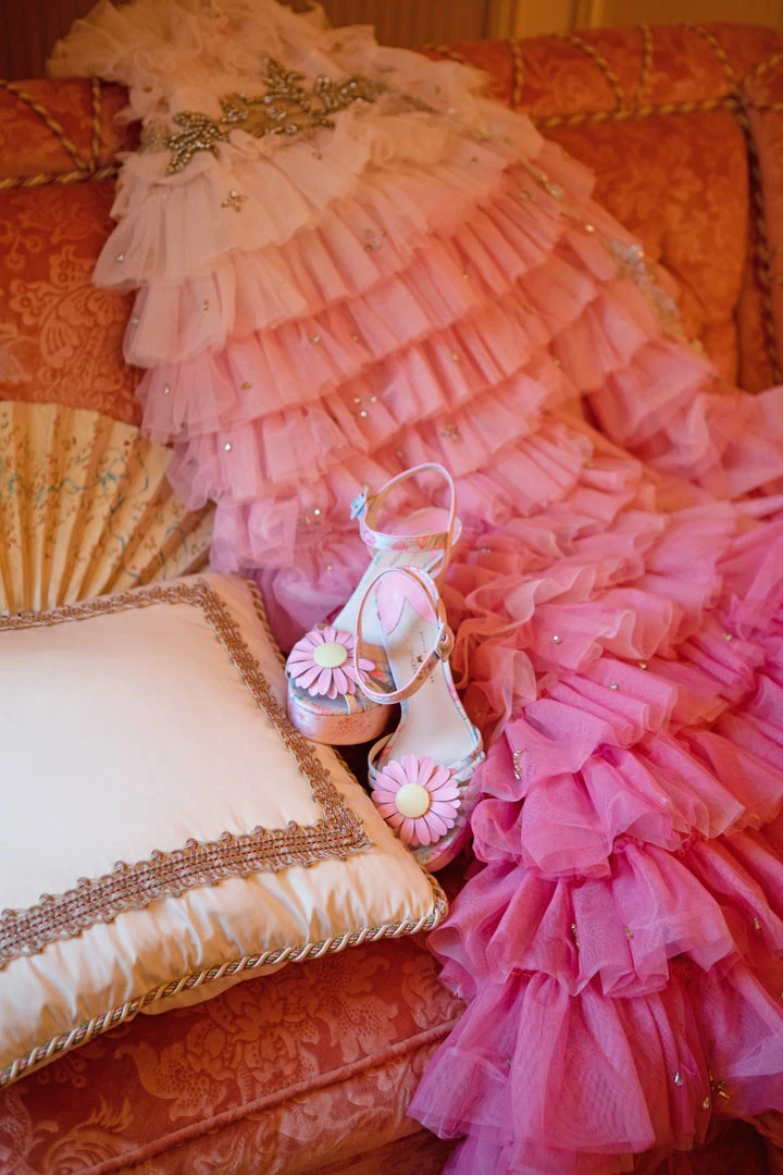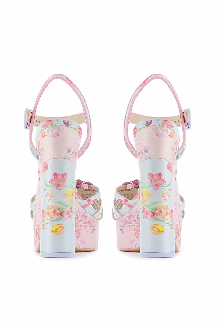 LoveShackFancy x Sophia Webster collection is here! If sunshine was a shoe it’d be the Celia Platform Sandal. This shoe has the sweetest, contrasting pastel floral print on satin and features a stand-out, molded calf leather sunflower for all the warm weather feels. Shown here in Soft Blush Multi.